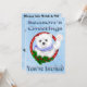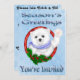 Season's Greetings Polar Bear Christmas Invitations front features a light blue background with white snowflakes, a Happy Polar bear wearing a blue scarf with a penguin on his shoulders wearing a Santa hat. Stylised red striped text is Happy Holidays, You're Invited! Back features a light blue background with snowflakes. Text is set up on the back to add your party details. We also have matching; stamps, address labels, cake toppers and candy tin party favours!