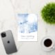 Below the sky, snow drifts cradle a peaceful landscape of blue and white fir trees, creating a serene holiday moment. The phrase “From our family to yours” is fully customisable, followed by editable fields for family member names and the year—making this card a heartfelt keepsake for loved ones near and far.