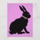 This postcard has a seated Easter or Spring time rabbit in black silhouette with a wreath of colourful pretty flowers around its neck and a pink eye on a pink background.