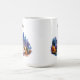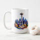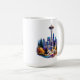 This ceramic coffee mug is shown in a beautiful watercolor art print of Seattle skyline.