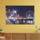 This image showcases the Seattle Great Wheel and the city skyline at night. The Ferris wheel is illuminated with white lights, standing prominently against the dark blue sky. Reflections of the city lights shimmer on the water in the foreground. A walkway with metal railings leads the viewer into the scene. Streetlights cast a warm glow on the walkway and surrounding area.