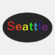 Oval sticker with Seattle in rainbow colours.