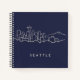 This design features a hand drawn sketch of the Seattle skyline on a dark blue background.