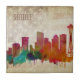 A neon watercolor outline of the Seattle city skyline with a distressed American flag backdrop.