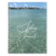 Ocean water notebook with custom text on the front. Blue-green, clear seawater photography with swirling script template for a name or title. The view is at an ocean inlet, with land and a lighthouse in the distance.