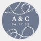 Coastal chic stickers for your wedding invitations or favours feature your initials and wedding date in white lettering on a slate blue grey background, flanked by looping nautical rope illustrations.