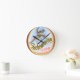 The clock did not take as long to arrive as I thought it might and was extremely well packaged. I didn't do the measurements so I didn't realize it is a little smaller than the average clock but that does not matter (just make sure you check if that's important to you).It is really nifty! It seems very solid and well made not flimsy at all. It has been going well and has kept good time in its few weeks on my wall. Nice product. Gets noticed too! Nicer in real life than the picture but true to the picture