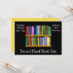 An invitation card suitable for a second hand book sale featuring cute and colourful books on a bookshelf and customisable text.