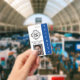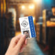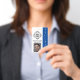 This identification badge for a security guard or employee features a white background with a sample logo in the centre. You can personalise the ID badge to display your own company, business or organisation logo, or your own custom image. There is an area beneath the logo to print an employee name or other text. The word "SECURITY" is printed along the right side over a blue banner. A sample photo is printed in the bottom portion which you can replace to make your own photo ID. The back of the badge has a blue background with white text where you can include your company phone number or other information.