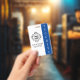 This identification badge for a security guard or employee features a white background with a sample logo in the centre. You can personalise the ID badge to display your own company, business or organisation logo, or your own custom image. There is an area beneath the logo to print an employee name or other text. The word "SECURITY" is printed along the right side over a blue banner. The back of the ID badge has a blue background with white text where you can include your company phone number or other information.
