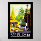Vintage travel poster for Burma (Modern Day Myanmar) with temple in the background.