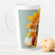 Sunflower and vegetables, custom tall latte mug for the gardener. Personalise with a name, or use the sample wording which is, "Professional seed saver". Grey-green background colour with a large orange and yellow sunflower. A border of vegetables, that includes a pumpkin, tomatoes, corn, peppers and cabbage, is across the bottom. This design also fits on the smaller cup.
