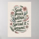 Embrace a serene vibe with this enchanting boho design featuring the inspiring quote Seek peace within and spread it around. Adorned in soft earthy tones of dusty rose sage green and warm beige, delicate nature illustrations including wildflowers feathers and mandalas create a tranquil ambiance. Gentle waves and swirling patterns symbolise harmony inviting you to embrace inner peace while sharing its beauty with the world