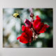 A photograph of a bumblebee flicking it's tongue out as it prepares to drink from a red snapdragon flower.