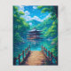 Step into a world of breathtaking tranquillity with this vibrant, anime-inspired Japanese landscape art print. This stunning piece captures a picturesque wooden pagoda nestled over a sparkling, azure lake, surrounded by a lush, emerald forest.