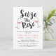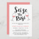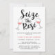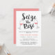 Rosé wine tasting party invitation in black, white, and pink with a pun on Seize the day: Seize the rosé. With two wine glasses and a pretty script. Also suited for rosé bridal showers or rosé birthday parties. Just change the custom text to suit your event. Rosé themed event invitation with pink as an accent colour.