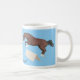 illustrated bay Selle Francais Horse leaping over a jump. light blue background, text says "Selle Francais" 3 times in black and browns.