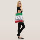 The Italian words for Always Family are Sempre Famiglia. Done in black script and tucked inside of the top of a heart on an all over printed tote with the colors of the Italian flag in the background.