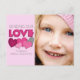 Add your own photo to send your love to friends and family on Valentine's Day. You can easily change the text to add your family names. Love is written in large dark pink letters with five hearts below. Four are different shades of pink and one is rustic grey planks. Happy Valentine's Day is written on the back in a pretty script. Your return address is above. I repeated the heart design at the bottom.
