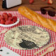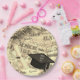 Senior graduation paper party plates with image of rolled diploma and graduation cap against a sepia background.