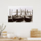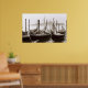 4 Gondolas sitting in the Grand Canal in the mornings mist in a sepia colour photograph.