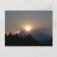 A photograph of the morning sun rising above the crest of Mount Rainier's mountain top.