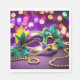 Mardi Gras sequin mask with gold necklace, feathers, and bokeh lights