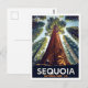 Capture the awe-inspiring scale of Sequoia National Park, California, with this dramatic retro travel postcard. The design showcases the colossal height of the ancient Giant Sequoia trees towering toward the sky, minimizing the hiker beneath to emphasize their immense size. This artwork perfectly conveys the grandeur and majesty of this California natural landmark, making it an excellent piece for nature lovers and collectors of US National Park posters.