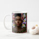 AI art depicting a beautiful black woman looking serene with a crown of flowers on her head. She looks like a princess or queen. generativecontent