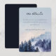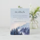This wedding enclosure card features a serene watercolor-style illustration of a misty forest landscape, creating a tranquil and ethereal atmosphere. The design showcases tall pine trees in varying shades of blue and green against a soft gradient sky transitioning from light to medium blue. Elegant script typography highlights the main heading "the details," while clean serif fonts provide additional information, ensuring readability and sophistication. Perfect for couples seeking a nature-inspired aesthetic, this card sets a calm and inviting tone for their special day.