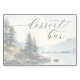 This wedding tabletop sign features a serene lakeside scene with soft, muted greens and blues creating a tranquil atmosphere. The watercolor art technique gives the design an ethereal quality, capturing rocky formations and evergreen trees in a realistic yet slightly abstract style. Elegant cursive typography highlights "dessert bar" and invites guests to indulge with "PLEASE TAKE A TREAT!" The overall mood is peaceful and welcoming, perfect for enhancing the ambiance of an outdoor gathering or event.