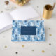 This wedding guest book features a serene wintery forest theme with stylised evergreen trees in various shades of blue, creating a frosty atmosphere. The design includes a centred navy-blue rectangle with elegant serif typography for names and date, adding a formal touch to the modern layout. The cool colour palette and clean lines evoke a sense of calmness and celebration, making it perfect for capturing memories at a winter-themed wedding.