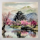 Immerse yourself in the serene beauty of this Japanese-inspired landscape, featuring a majestic traditional castle surrounded by vibrant spring blossoms. Soft pink cherry trees line the reflective waters, creating a dreamy mirror image beneath towering misty mountains. Painted with delicate watercolor textures and rich atmospheric tones, this artwork blends tranquility, nature, and classic architecture into a peaceful, captivating scene.