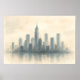 A serene view of a city skyline reflected in water, rendered in soft tones. The tall buildings create a harmonious balance against a hazy background.
