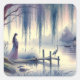 Serene Fantasy Lake with Willow and Heron Square Sticker