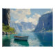A tranquil fjord with towering cliffs and crystal-clear waters, reflecting the bright blue sky and scattered clouds. A lone wooden boat drifts gently, surrounded by breathtaking natural scenery, evoking a sense of solitude and serenity.