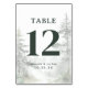 This wedding table card features a serene forest scene with tall pine trees in muted greens and greys, creating an ethereal atmosphere. The design showcases a bold number "12" at the centre, surrounded by ample negative space for clarity. Customisable text fields allow for personalisation with names and dates, while the typography combines elegant serif and clean sans-serif fonts to enhance readability and style. Perfect for weddings or formal gatherings, this card exudes tranquillity and nature-inspired beauty, making it an ideal addition to any event setting.