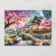 A tranquil Japanese garden scene during twilight, illuminated by the soft glow of paper lanterns. Cherry blossom trees in full bloom frame a traditional wooden house with shoji screens glowing warmly from the lights inside. A winding stone path crosses a shallow, reflective pond, leading to the house and surrounded by rocks. A cat sits contemplatively on the path, adding to the serene ambiance. In the foreground, a stone lantern stands beside vibrant pink flowers, while the background features a bamboo grove and a sky filled with distant fireflies and birds. The scene captures the essence of peace and natural beauty, enhanced by the harmonious blending of architecture and nature.