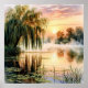 Tranquil lake scene at sunrise featuring a weeping willow tree, lily pads, and gentle morning mist. Soft reflections on the water enhance the calm and serene atmosphere.