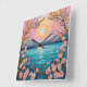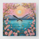 In the foreground, blossoming cherry trees with delicate pink flowers frame the image, their branches curling gracefully. The water below mirrors the colours of the sky, reflecting the tranquil mood, while golden accents, possibly depicting sunlight, add a touch of warmth and brightness. Overall, the image evokes a sense of peace and natural beauty.