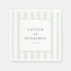 These wedding napkins feature a minimalist and elegant design with vertical stripes in soft shades of mint green and white, creating a serene and fresh atmosphere. The central white square highlights customisable names and date in classic serif typography, adding a touch of sophistication. Perfect for formal occasions, the clean lines and subtle pattern emphasize clarity and focus, making them ideal for weddings that celebrate simplicity and tranquillity.