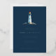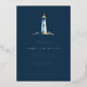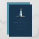 This elegant wedding invitation features a serene lighthouse illustration set against a deep navy blue background, creating a classic and timeless aesthetic. The design uses clean lines and subtle shading to highlight the white lighthouse with a red roof perched on rocky terrain, evoking a sense of calmness and anticipation. The typography is formal and sophisticated, with a centred layout that balances the composition beautifully. Perfect for a beach-themed or coastal wedding, this invitation captures the mood of tradition and elegance, making it an ideal choice for couples seeking a refined touch for their special day.