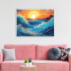 A calming semi-abstract depiction of ocean waves crashing at sunrise, showcasing deep blues, teal, and soft orange hues. This serene artwork evokes a sense of peace and tranquillity for coastal lovers.