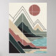 Geometric mountain landscape design combines clean lines and abstract shapes to create a modern, minimalist work of art. Inspired by the natural beauty of mountains, sunshine, and lakes, this artwork features a sophisticated earth color palette including warm terracotta, sage green, soft beige, and deep dark tones.