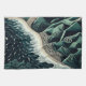 Serene Shores: This stunning top-down illustration captures the harmony of land and sea, featuring waves gently breaking on sandy beaches with lush green mountains in the background. Rendered in soothing shades of dark blue-green, the artwork evokes a sense of tranquility and balance. The intricate detail of the ocean’s patterns meeting the shore, paired with the trees lining the water’s edge, enhances the peaceful atmosphere. Created in a woodcut print style with simple lines and a flat design, the piece is reminiscent of hand-drawn animation, offering a timeless, serene depiction of nature’s beauty.