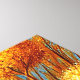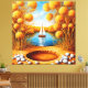 Vivid artwork featuring a tranquil sunset, a sailboat reflecting on calm waters, golden trees, and scenic surroundings imbued with warm colours and harmonious composition evoking peace and relaxation.