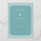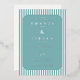 This wedding invitation features a modern and minimalist design with a rectangular layout framed by alternating white and teal blue stripes. The central portion is filled with a solid teal background, bordered by an octagonal frame that adds depth to the composition. The elegant serif typography enhances the formal yet inviting tone, while the clean lines and cool colour palette create a serene and sophisticated atmosphere. Perfect for couples seeking a stylish and straightforward invitation, this design emphasizes clarity and simplicity, making it ideal for contemporary weddings.