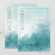 This wedding program features a modern and elegant design with a watercolor background in shades of teal and turquoise, creating a serene and romantic atmosphere. The layout is divided into two sections by a central white space, with the word "WELCOME" prominently displayed vertically on the left side in bold, sans-serif typography. On the right, a structured list outlines the ceremony schedule using a smaller serif font, while the names and date are customisable placeholders at the bottom. The overall style blends minimalism with sophistication, making it perfect for a formal wedding celebration.