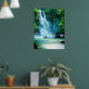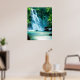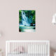 Poster in an illustration of a cascading waterfall in pale blue with white spray, surrounded by boulders and green leaves