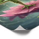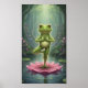 This whimsical poster features a green frog in a yoga tree pose atop a pink lotus on a sunlit forest pond, surrounded by glowing sparkles, wildflowers and serene reflections.